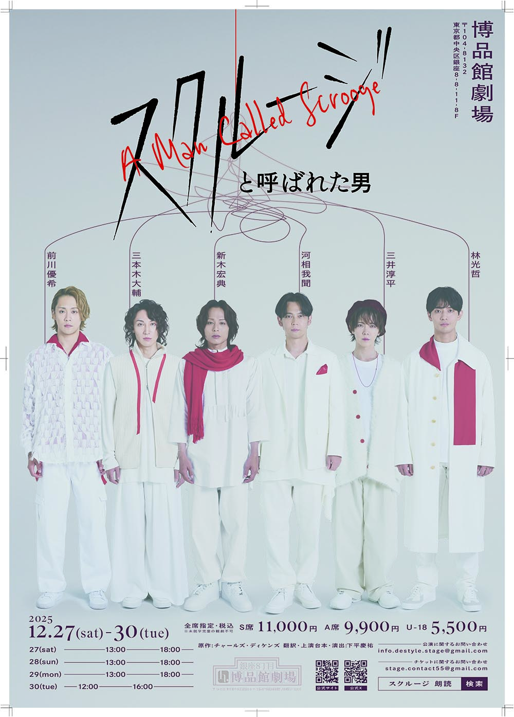 原作:チャールズ・ディケンズ ■出演 ■チケット代金: S席:A~G列 ※U-18は一般発売からの取り扱いとなります。 ■前売開始:10月4日(土)正午 ■チケット取扱: ■公演公式サイト https://xmascarol-scrooge.com 公式X(旧Twitter)https://x.com/readingactstage ■公演に関するお問い合わせ info.destyle.stage@gmail.com チケットに関するお問い合わせ stage.contact55@gmail.com