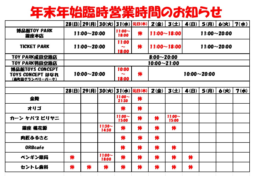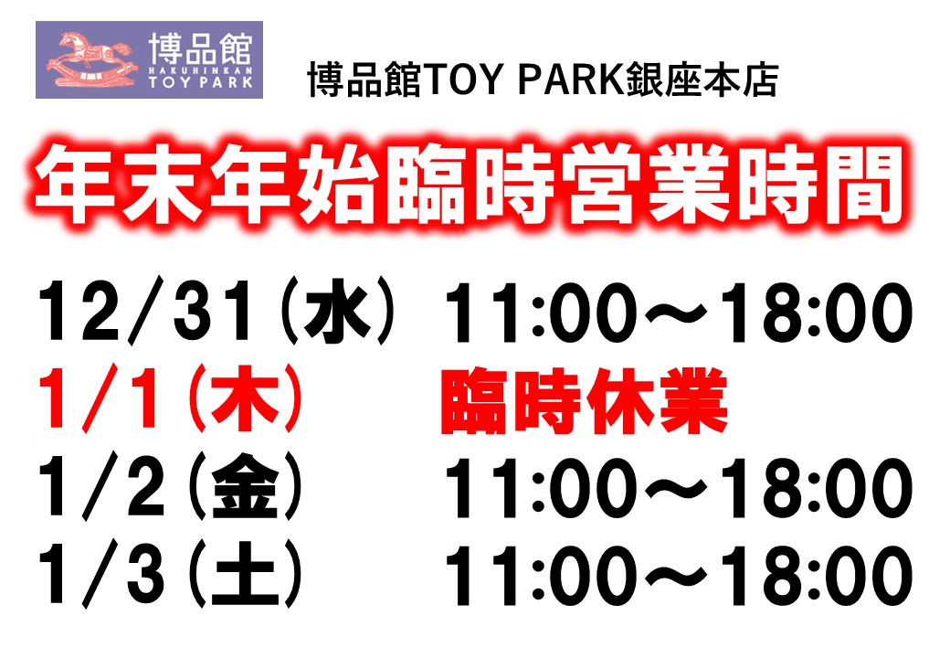 博品館TOY PARK銀座本店年末年始営業時間のお知らせ